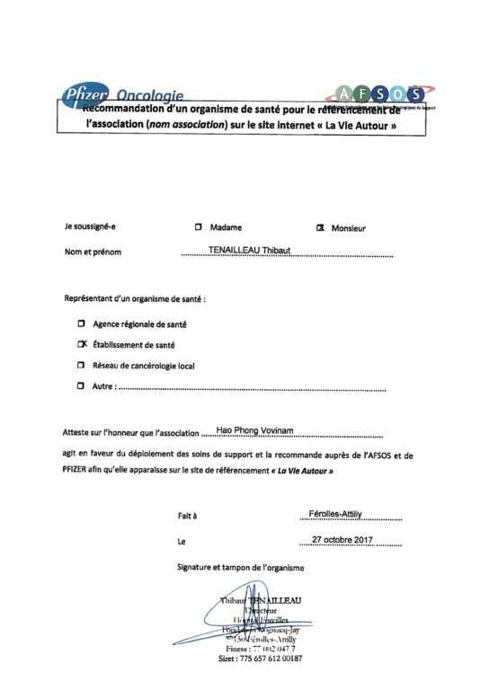 Attestation de l'activité Vovinam Cancer comme faisant partie des Soins Oncologiques de Support