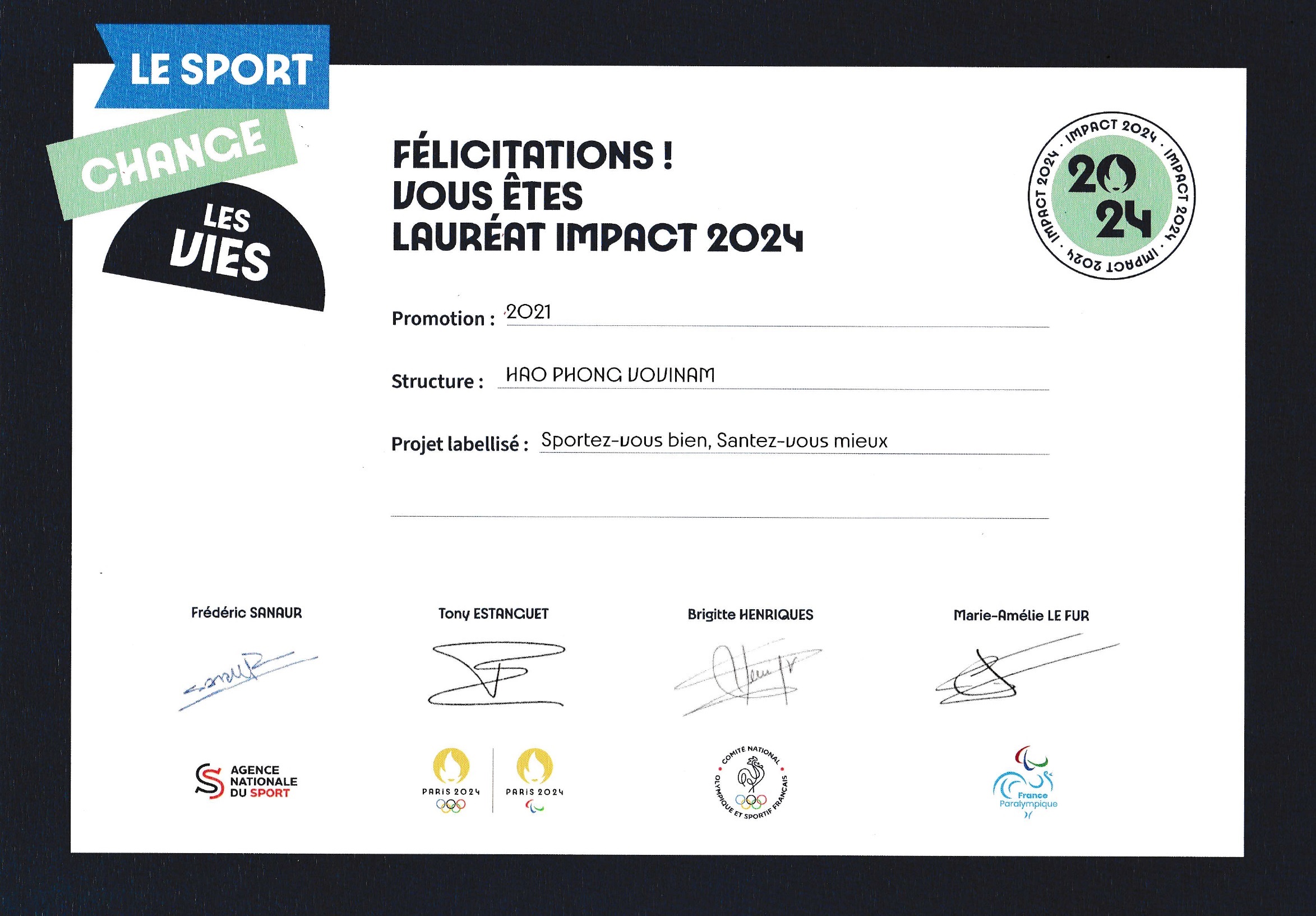 Le diplôme de Lauréat Paris Impact 2024 pour l'APA Sportez-vous bien, Santez-vous mieux.